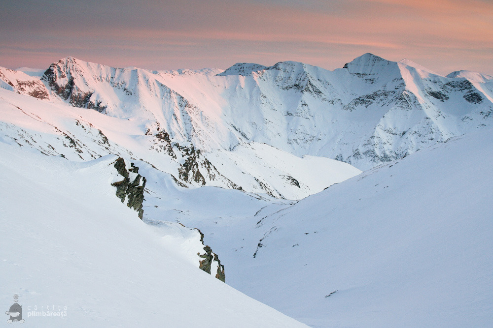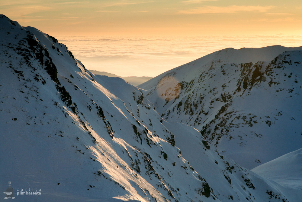 Zapada nu ne-a facut probleme, poteca era deja batuta, asa ca intr-o ora, o ora si ceva, am urcat fara probleme de la Cabana Balea pana sus in creasta, in Saua Capra si de aici inca putin pe traseul ce duce spre varful Vanatoarea lui Buteanu. Pe varf nu am ajuns, pentru ca toate calculele noastre aratau ca nu o sa mai ajungem la timp si in Sibiu, asa ca ne-am multumit sa privim de pe creasta ultimul apus de soare din an, si sa ne bucuram si de frumoasa mare de nori asezata peste intreaga depresiune a Fagarasului.